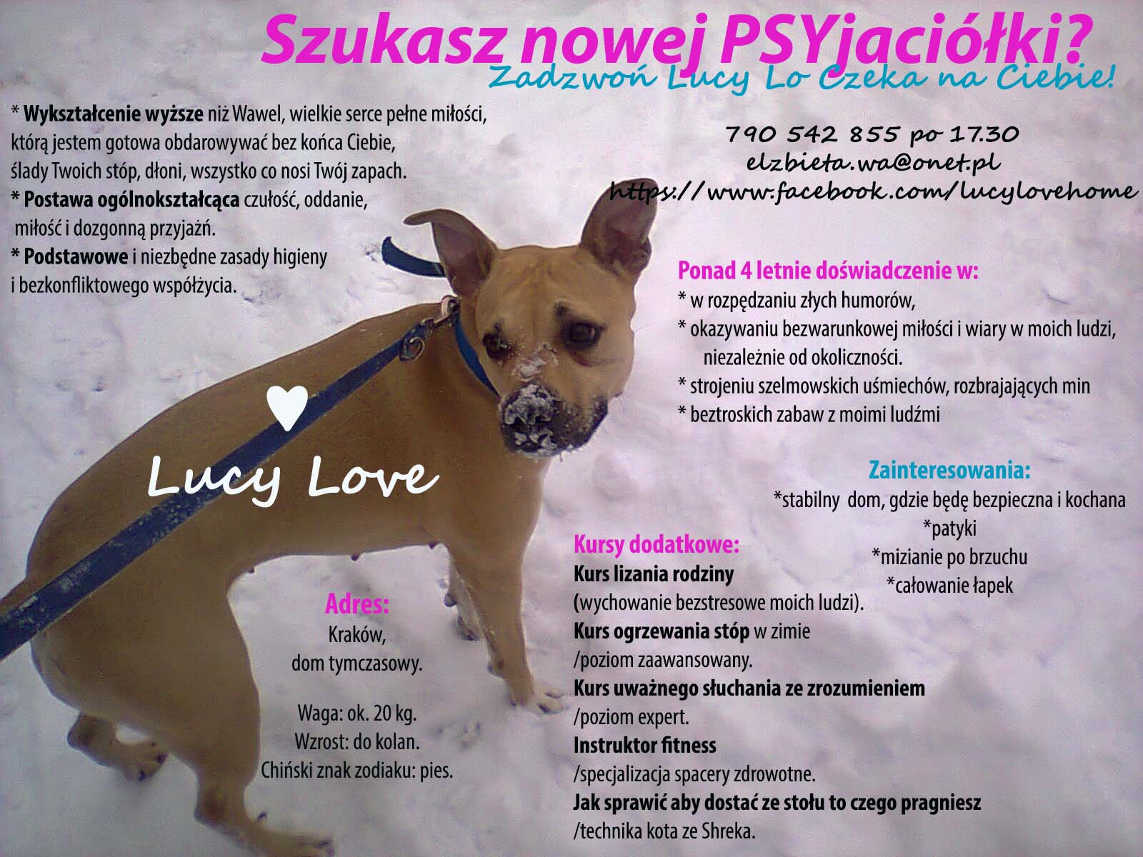 Czy pomogłaby mi Pani poszukać dla niej domu. Zapewne ma Pani rozległe kontakty w Krakowie i okolicach, będę niezmiernie wdzięczna za każdą informację, pomysł, inicjatywę. I ja i Lucy. Z pewnością oddam każdą przysługę dalej po stokroć w swoim życiu, to jak najbardziej honorowe zobowiązanie.