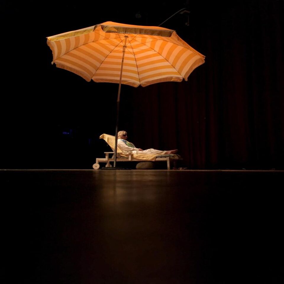Krystyna Janda w roli Sabiny staje przed widzami w szarej scenerii, patrzy na widownię oczami kobiety, która rozerwała serce na pół aby przeżyć.