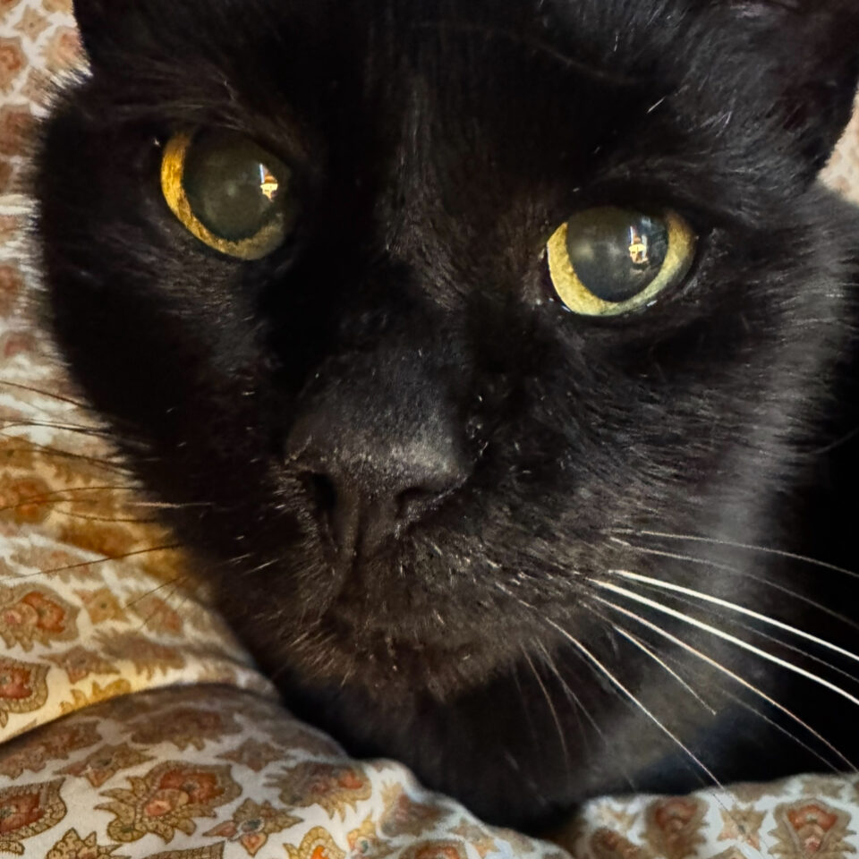 Po moim powrocie kocica Panna Kociołek, wciąż w żałobie po niespodziewanej śmierci swojej pani Marysi Bojarskiej, po której u nas znalazła przyjazny dom, przyszła do mnie pierwszy raz do łóżka, na powitanie! Po dwóch latach osobności i kociej żałobnej depresji. Witam smutny kocie!
